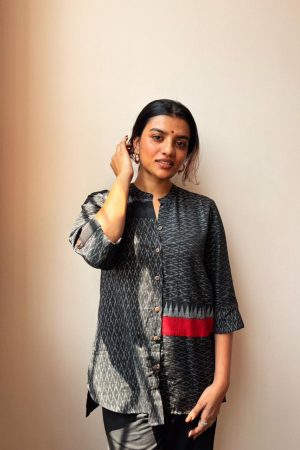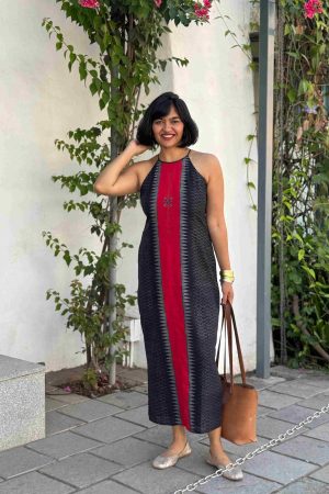 Crafted in handloom fabric and finished with a striking black kuppadam border weave, this sleeveless dress blends traditional artistry with contemporary design. The embroidered bhutta motifs add subtle charm, while the high round neck and elegant side slits create a silhouette that’s refined yet effortless. With delicate button detailing at the back, The Kaira Dress moves gracefully from day to evening – a piece that feels as poised as it looks.