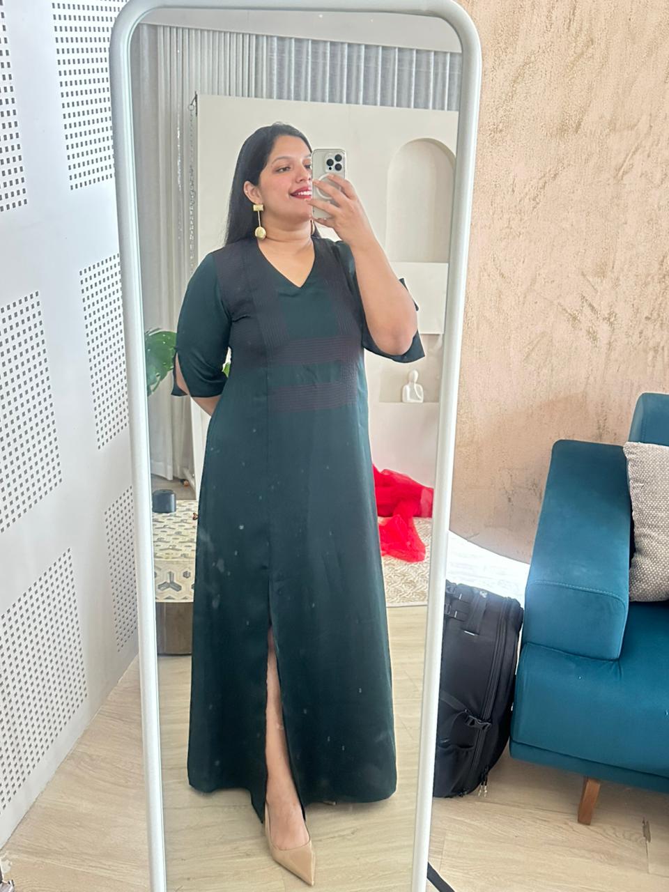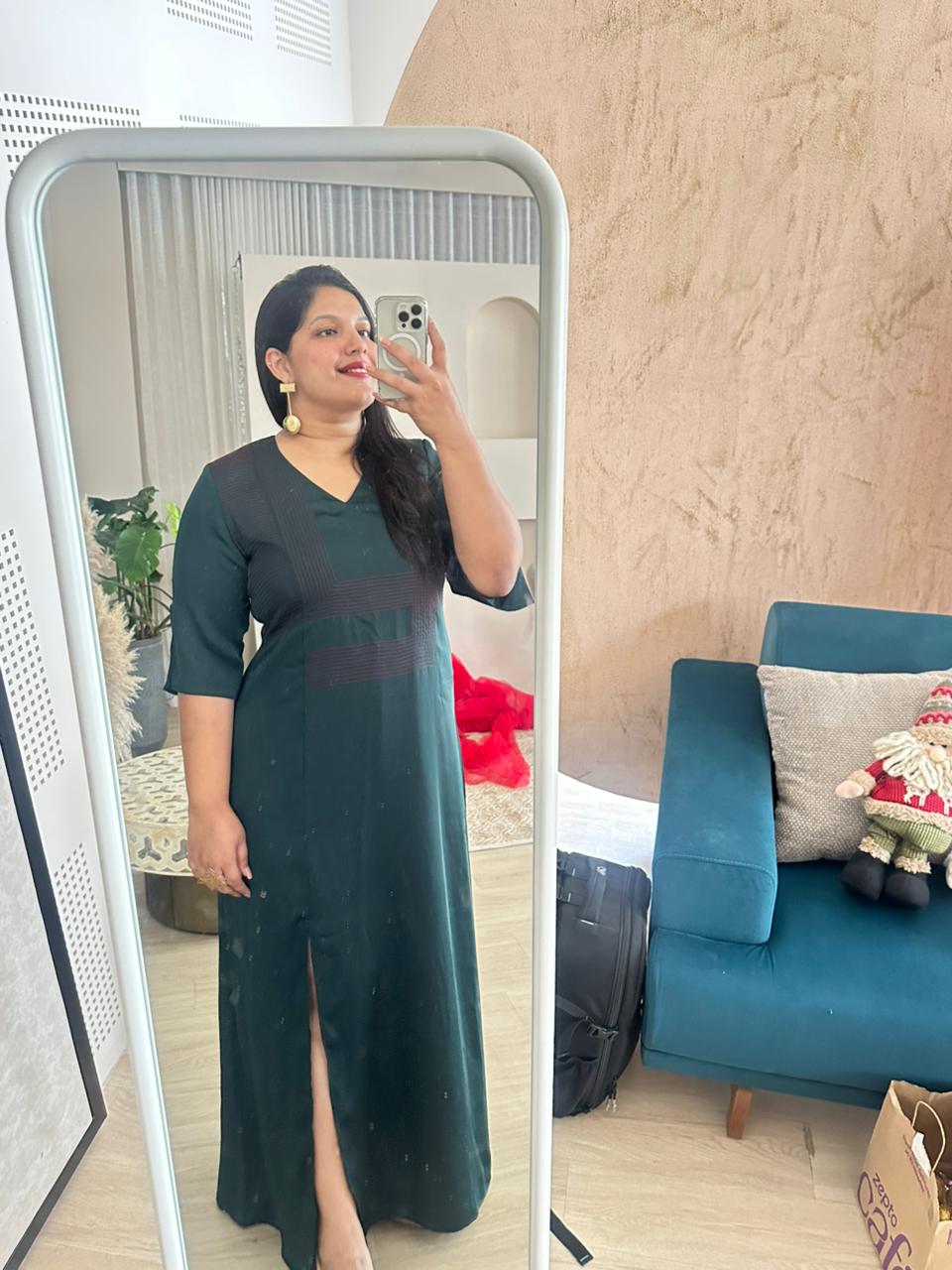 Crafted in a deep bottle-green blended fabric, this full-length dress is designed to flatter effortlessly. The soft V-neckline brings feminine definition, while the high slit adds just the right touch of festive glam, balancing modesty with movement.