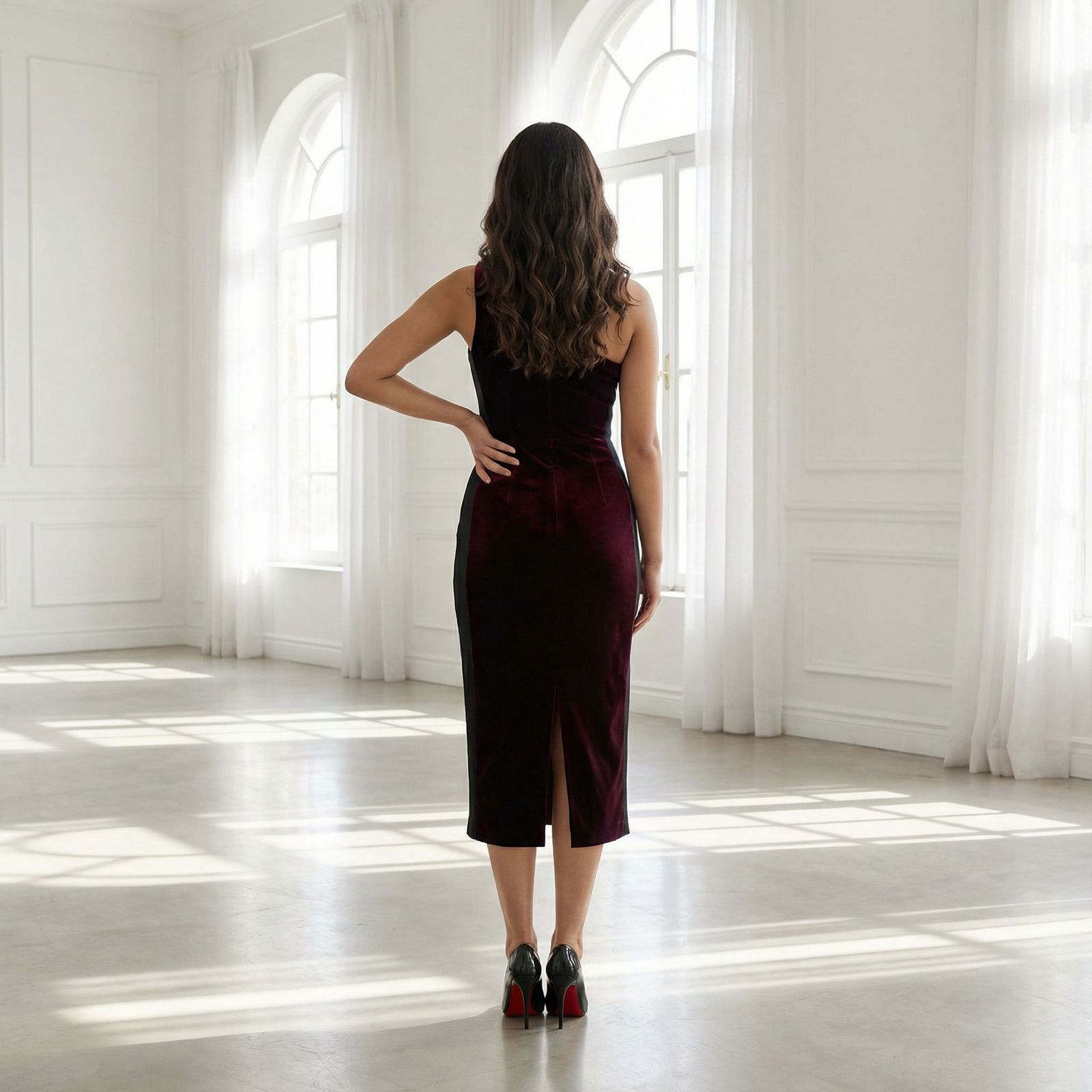 Embellishments & Detailing: Minimalist finish to highlight the richness of velvet; refined stitching along the neckline and slits.