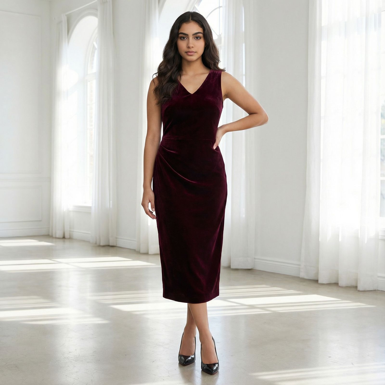 Crafted in a deep maroon velvet luxe fabric, this dress is designed to feel as indulgent as it looks. The flattering V-neckline brings softness and elongation, while the clean silhouette lets the richness of the velvet take centre stage. Subtle back slits add femininity and ease of movement, ensuring comfort without compromising structure. Perfect for evenings that call for understated glamour, The Velvet Noir Dress drapes beautifully, catching the light with every step — timeless, graceful, and effortlessly festive.