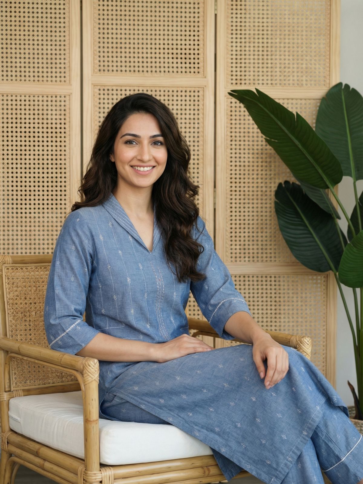 Crafted in pure cotton, The Verve Co-ord Set is designed for effortless comfort with a refined edge. The kurta features a structured collar that flows into a subtle V neckline, creating a silhouette that feels both strong and feminine.